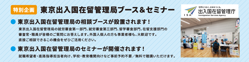 併催企画 | セミナー(企業向け、学校向け、就職希望者向け) 外国人雇用協議会主催 大交流会(BtoB) 就職相談所 大抽選会 |